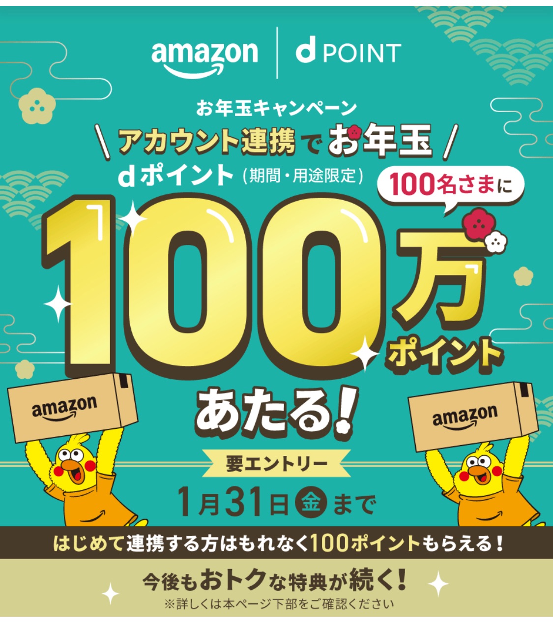 Amazonでdポイントをアカウント連携すると100ポイント貰える(100万ポイント貰えるかも) ~1/31 キャンペーン X Facebook はてブ Pocket LINE コピー 2025.01.09 Amazonでdポイントとの連携キャンペーンを実施中。 キャンペーンサイトにてエントリ後にアカウント連携するともれなく100ポイントが貰える さらに抽選で100名へ100万ポイントが当たる! まだ連携させていない人はエントリーしておきましょう